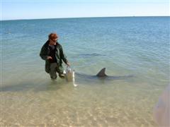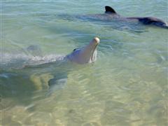 Wie wir an der Rezeption des Campingplatzes erfahren hatten, begann die Delphinfütterung in Monkey Mia, ca. 20 km entfernt von Denham, täglich gegen 8 Uhr, abhängig vom Erscheinen der Tiere. Also mussten wir heute zeitig aufstehen, um rechtzeitig vor Ort zu sein. Wir waren kurz vor 8 Uhr an der Kasse und bekamen die Auskunft, dass die Tiere heute besonders früh dran waren. Am Strand oder genauer gesagt im Wasser stand schon eine Rangerin, die sich mit den Tieren beschäftigte. Etliche Besucher waren ebenfalls schon da, allerdings nicht annähernd die Massen, die wir erwartet hatten. Gut für uns, so konnten wir mehr sehen.