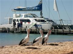 Da täglich nur maximal 3 Vorführungen bzw. Fütterungen stattfinden, hatten die Massen, die jetzt nach und nach eintrafen, einen schlechten Tag erwischt. Sie mussten, um überhaupt Delphine zu sehen, eine der zahlreich angebotenen Bootstouren buchen. Als unsere Tour näher rückte, fürchteten wir schon, die Einzigen an Bord zu sein, aber kurz vor Abfahrt kamen noch eine australische und eine französische Familie an Bord. Der Kapitän hielt eine kurze Einführungsrede und dann ging es los. Für die weitere Unterhaltung war eine junge Holländerin zuständig. Zuerst musste das Segel gesetzt werden. Daran sollten sich alle Männer beteiligen, da nicht allzu viele davon an Bord waren, durften auch die Frauen helfen.